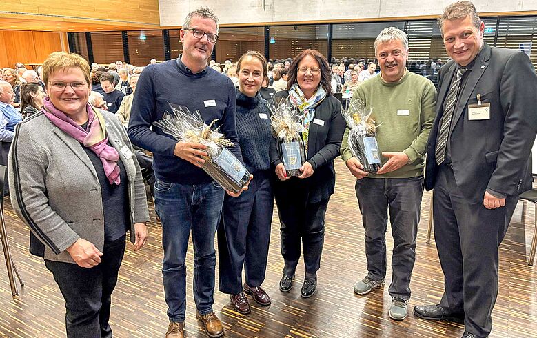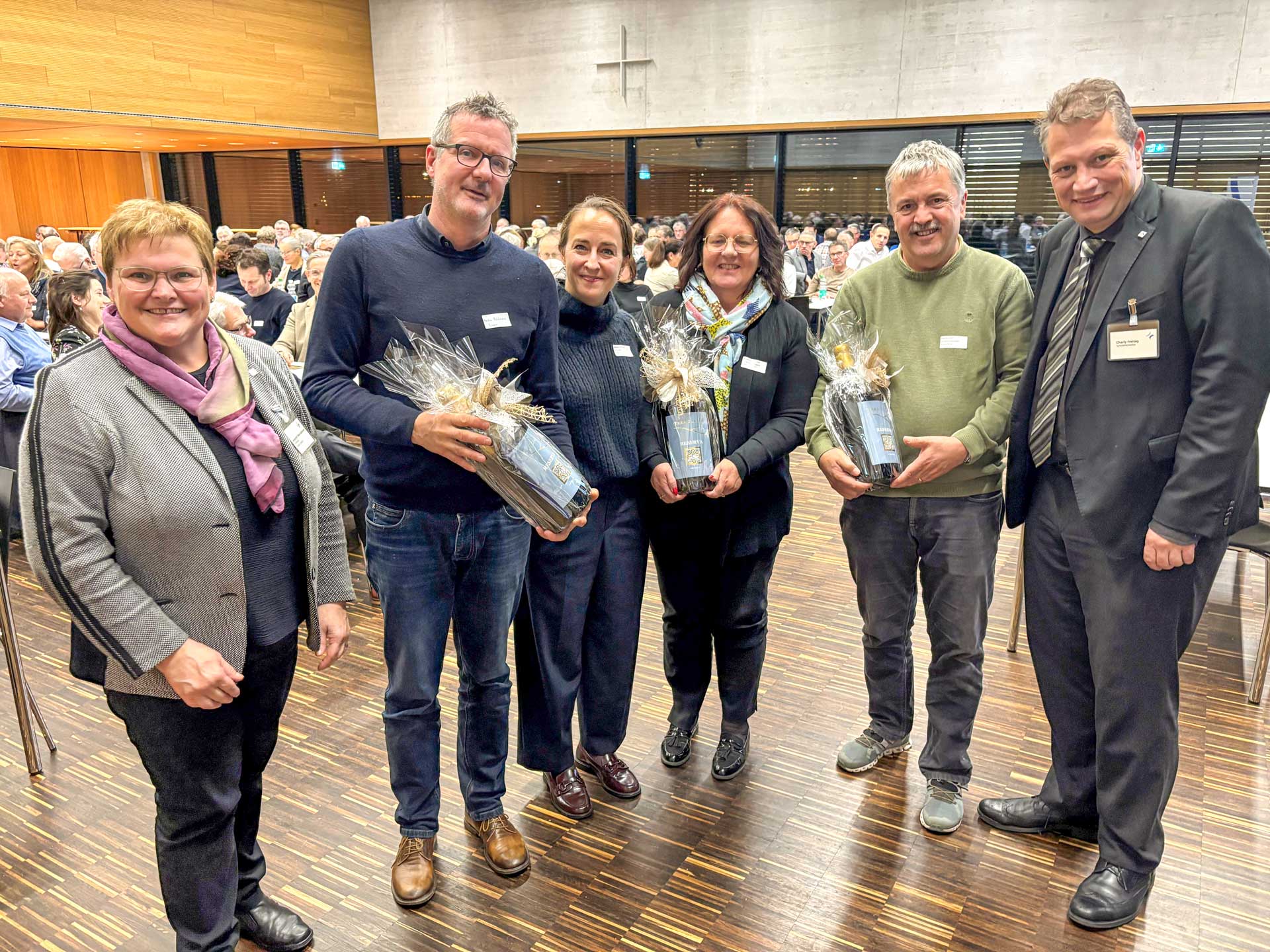 Synodalrätin Annegreth Bienz-Geisseler (links) und Synodalverwalter Charly Freitag (rechts) zeichneten an der Sursee-Konferenz drei Kirchgemeinden für ihr Engagement für eine grüne(re) Kirche aus (von links): André Bachmann und Stephanie Plersch Jurt (Luzern), Daniela Merkel (Littau) und Peter Kaufmann (Buchrain). | © Dominik Thali